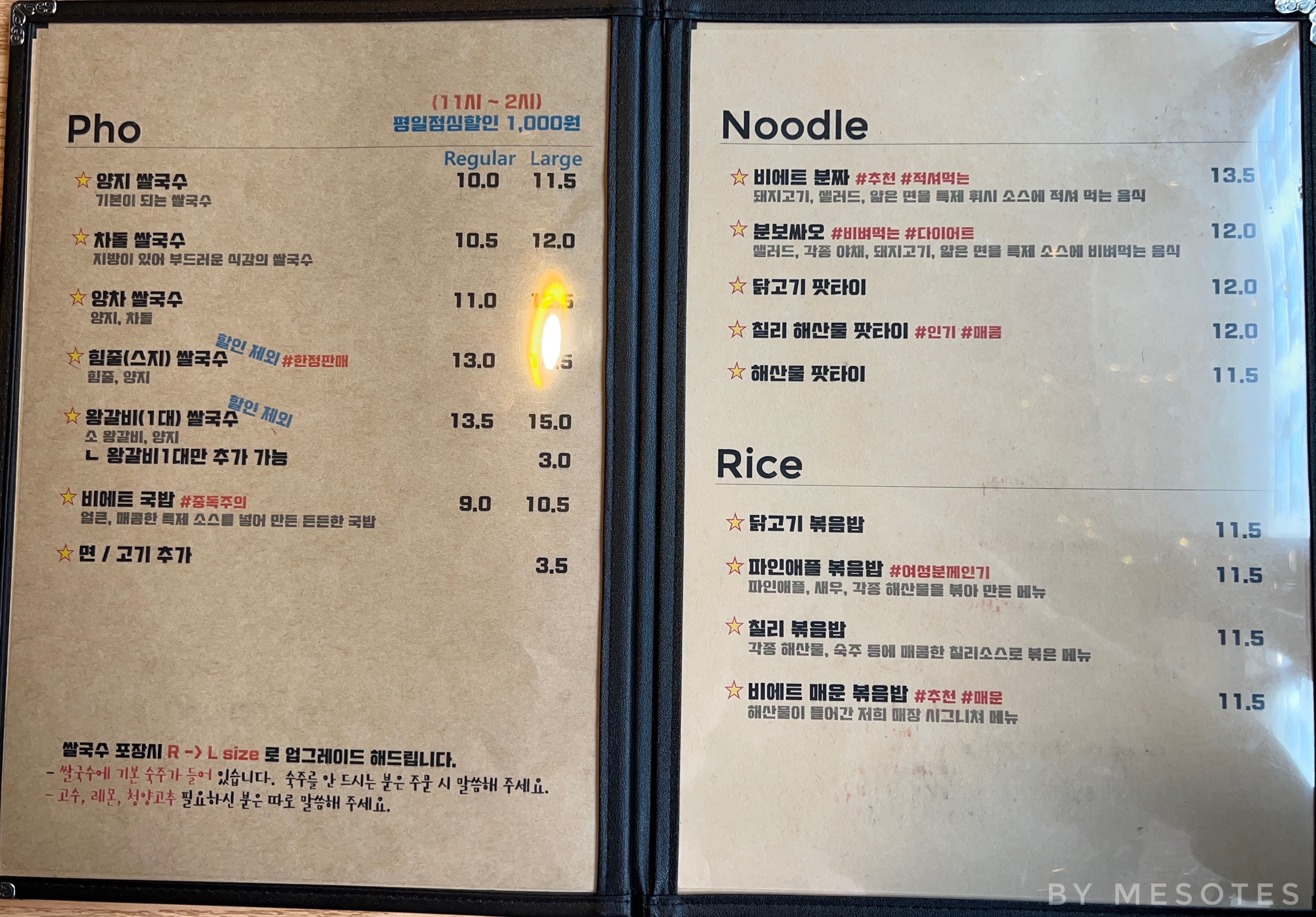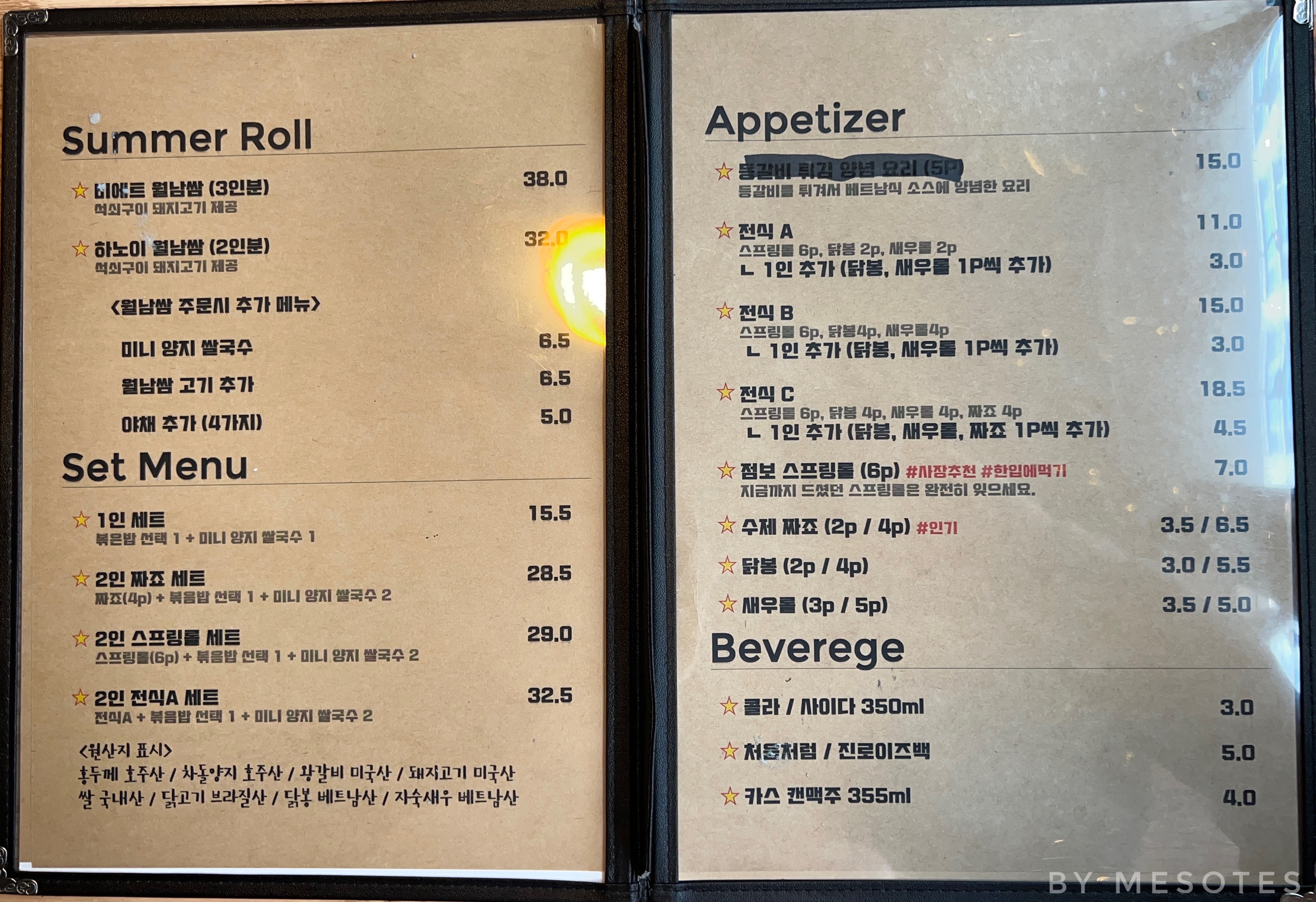 전형적인 베트남 음식점 메뉴다.