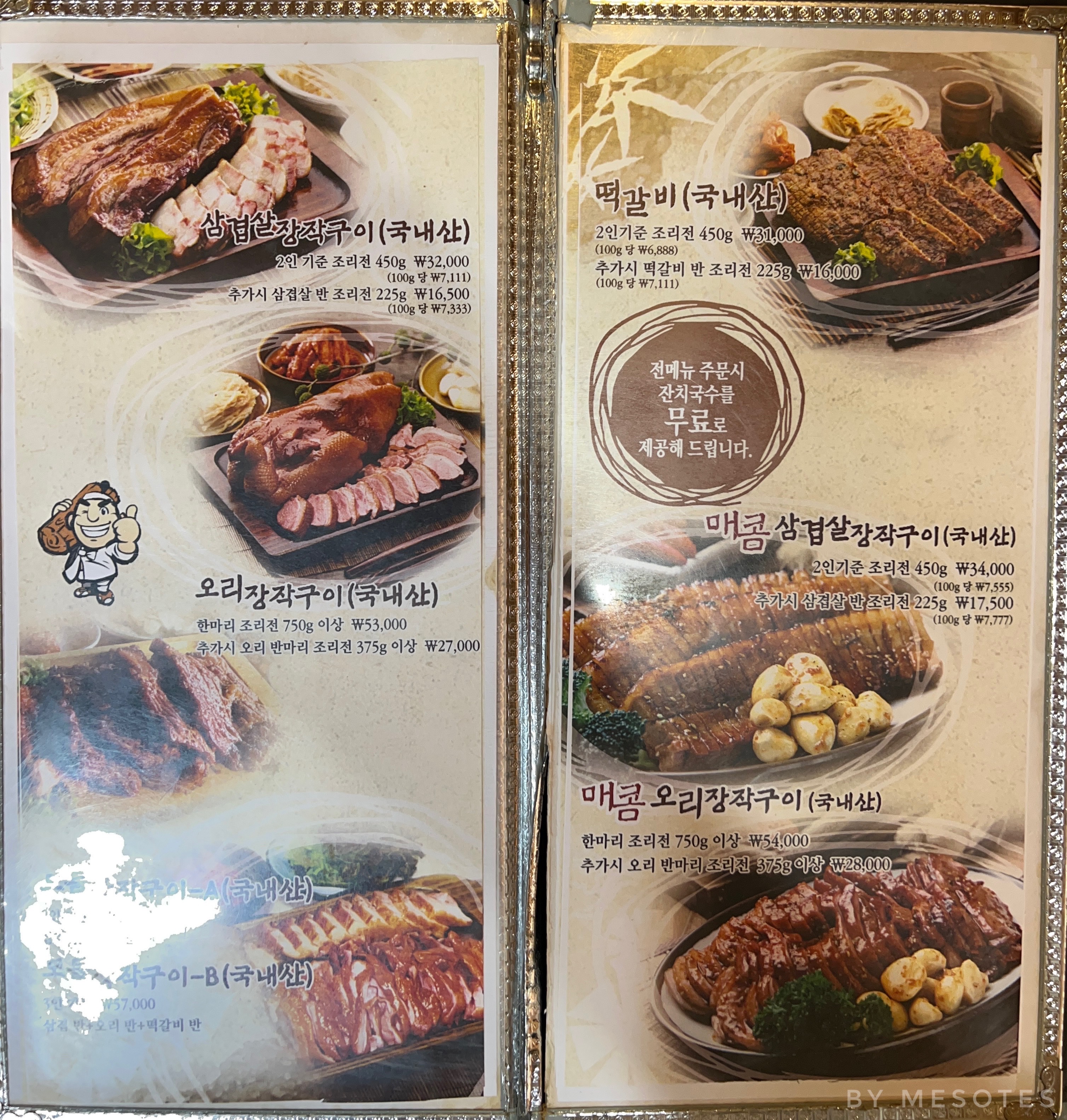 오리 장작구이, 삼겹살 장작구이, 잔치국수