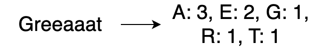 등장하는 character를 key로, 출현빈도수를 value로 하는 map을 선언하고 단어를 탐색하며 빈도를 map에 기록한다.