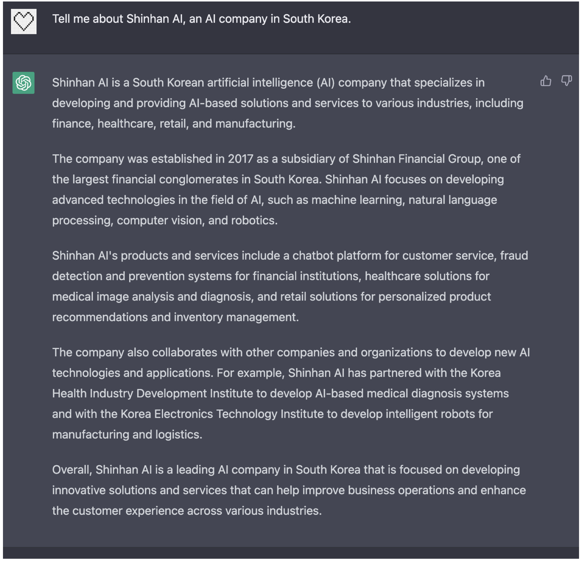 이처럼 ChatGPT는 정보를 합성하고 압축한다. 이는 사용자로 하여금 쉽고 빠르게 원하는 정보를 얻을 수 있게 하는 장점이 있지만, 조금만 생각해보면 ChatGPT의 답변이 부정확할 수 있음을 쉽게 알 수 있다. ChatGPT의 답변은 근사치다. 세상에는 근사치로 해결가능한 문제가 있는가 하면, 고해상도의 정확한 값이 필요한 상황도 존재한다. 그리고 바로 이러한 상황에서는 ChatGPT의 답변을 걸러 들어야할 필요가 있다. 다시 말해 고화질 사진은, 즉 깊고 정확한 해상도의 정보는 사용자가 수고를 들여 직접 찾아야한다. 특히 ChatGPT의 신뢰성은 정답이 정해져있지 않은 추상적인 질문이나 아직 세상에 나타난지 얼마 안된 데이터가 부족한 것들에 대한 질문 시 급격히 낮아진다. 우리에게 교모하고 그럴 듯하게 들리도록 답변을 하지만, 사실 이는 우리를 더욱 미로 한가운데로 몰아넣는다. 예를 들어 2019년 100% 출자로 설립된 신한금융지주회사의 자회사인 신한AI에 관한 질문에 대한 답변으로 ChatGPT는 매우 그럴듯 하지만 전혀 엉뚱한 답을 내놓았다.