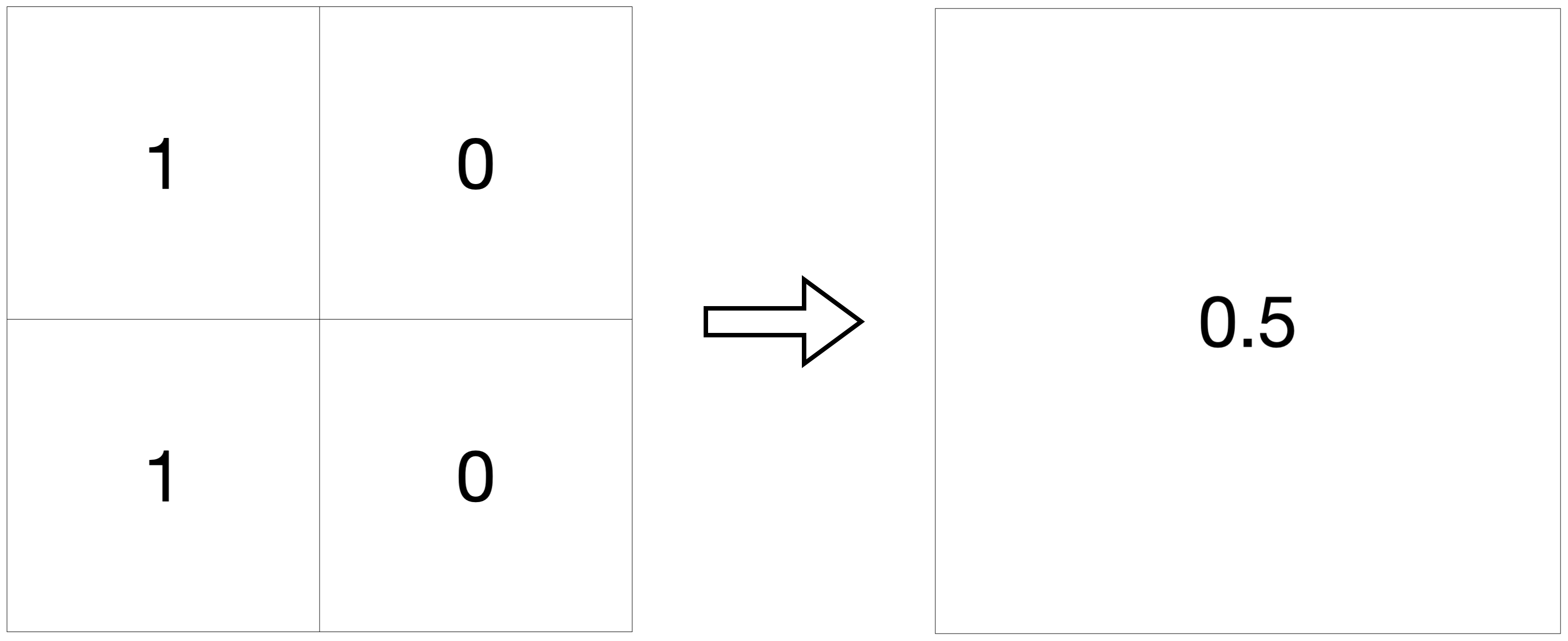 보통 디지털 사진을 전송하거나 할 때 원본 그대로 사용하지 않는다. 큰 용량을 줄여 압축을 한다. 압축은 다음처럼 인접한 4칸의 정사각형을 하나로 합치고 평균값의 정보만 남기는 식으로 가능하다. (eg. (1 + 1 + 0 + 0) / 4 = 2 / 4 = 0.5)