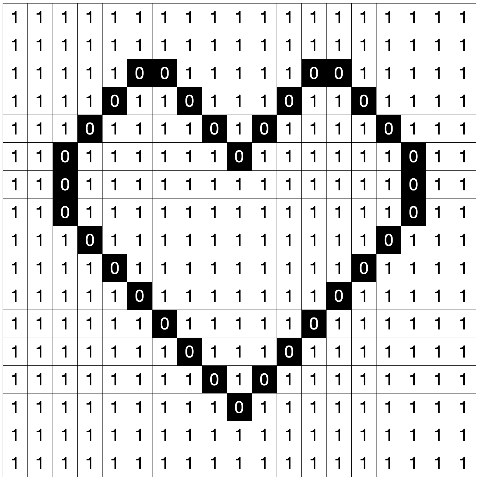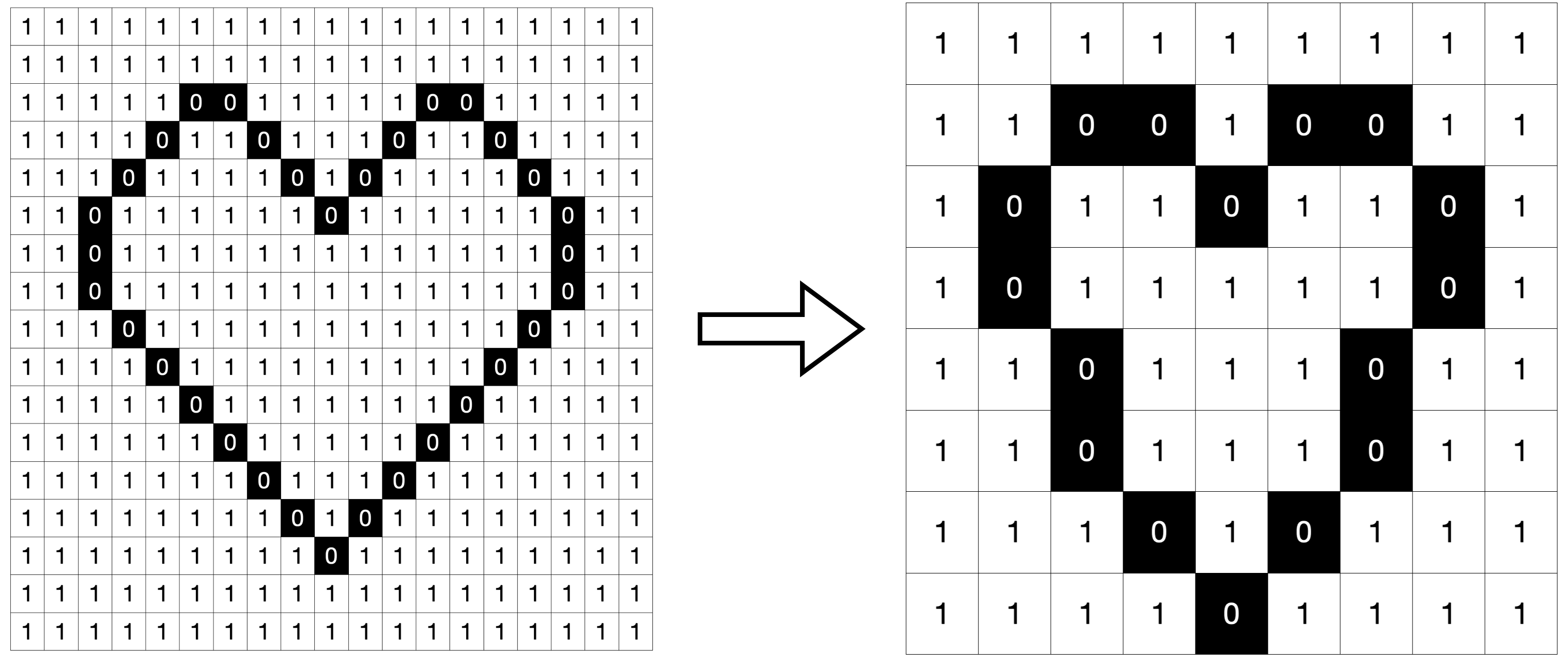 사진 또한 다음처럼 0과 1로 표현가능하다. 다만 1차원의 약속이 아닌 2차원의 약속일 뿐이다. 다만 이 사진의 경우 문제가 있다. 지극히 단순 흑백이라는 점이다. 농도를 표현하기 위해 한 칸 한 칸에 0과 1 대신 3까지의 숫자를 집어넣어보자.
