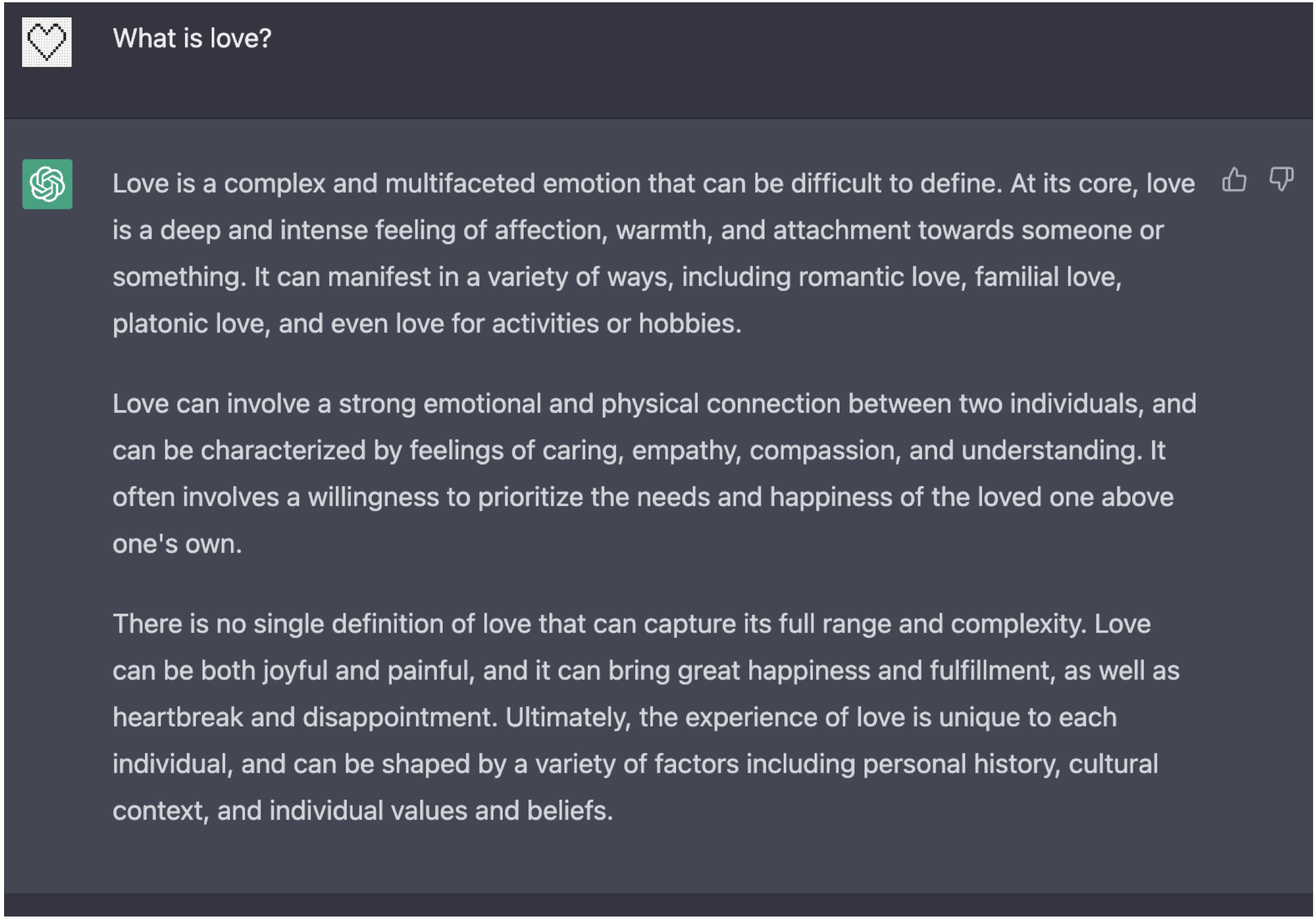 현재 검색 엔진은 우리가 입력한 값에 대해 가장 유사한 ‘원본 사진’을 찾아서 결과로 보여준다. 즉, 인간이 만든 웹 상의 원본 정보들 중 가장 사용자가 필요로 할 것이라 예상되는 정보를 결과로 출력한다. 반면 ChatGPT는 ‘합성 및 압축된 사진’을 보여준다. 예를 들어 보자. “What is love”를 ChatGPT에서 검색했다고 해보자. 일반 웹 검색이었다면 보편적 의미에서 사랑이란 무엇인지에 관한 글, 성경에서 말하는 사랑, 사랑을 설명하기 위한 예시 사례, 심지어 노래 가사에 이르기까지 사람들이 웹에 올린 원본 정보를 보여줄 것이다. 그러나 ChatGPT는 위와 같은 정보들을 합성할 것이다. 뿐만 아니라 간결한 핵심 포인트를 Output으로 출력하기 위해 합성된 글을 압축할 것이다.