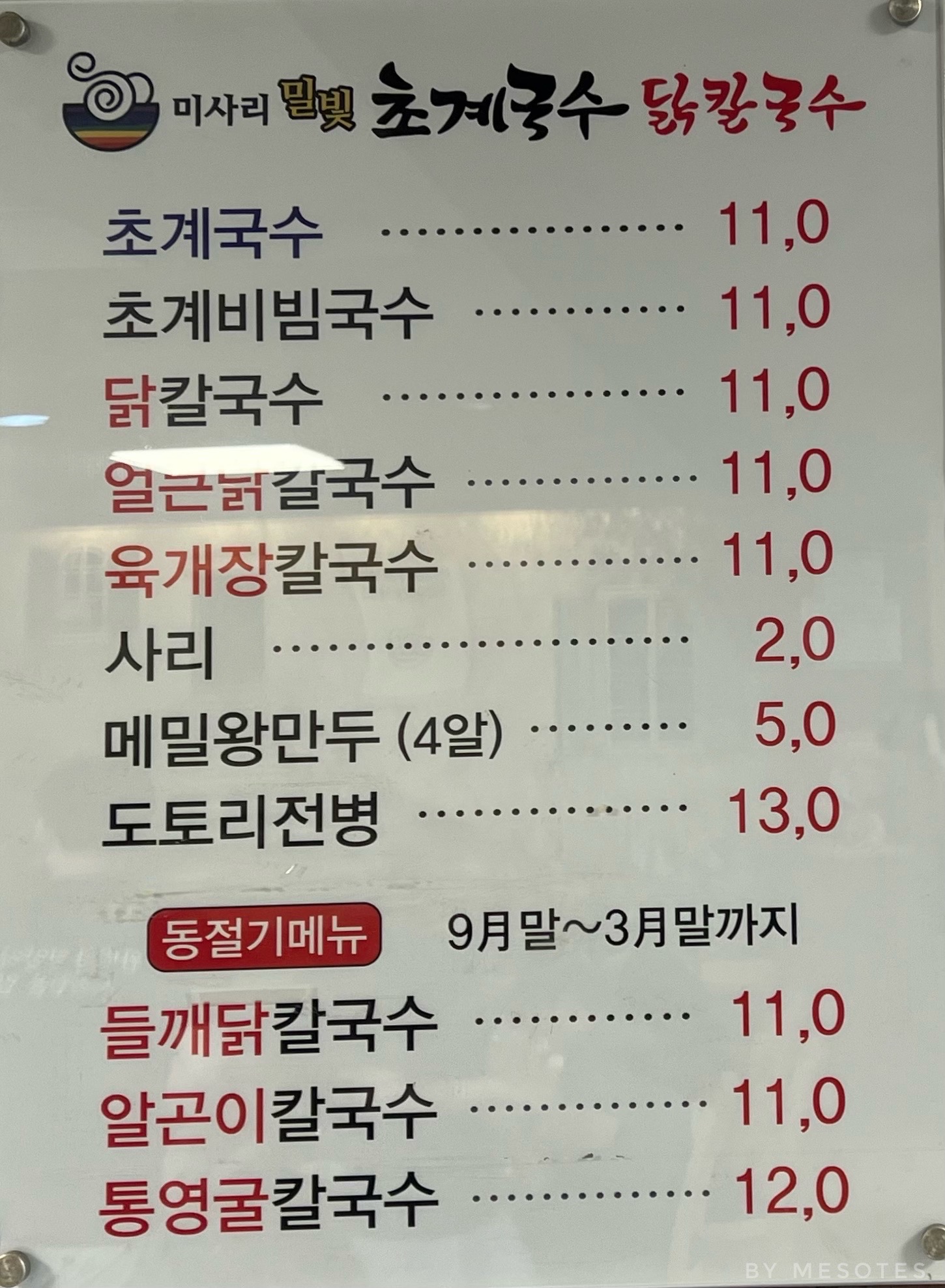 초계국수, 초계비빔국수, 메밀왕만두(4알), 얼큰닭칼국수, 들깨닭칼국수, 도토리전병