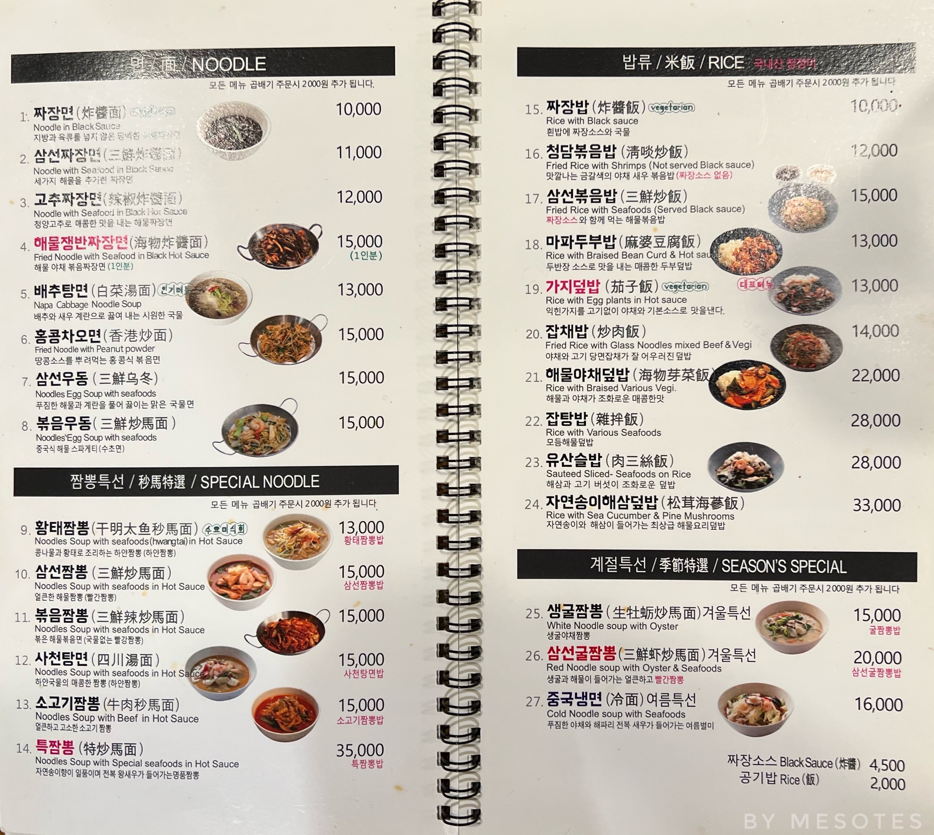 삼선짜장면, 삼선짬뽕, 볶음우동, 사천탕면, 중국냉면, 짜장밥, 가지덮밥, 탕수육