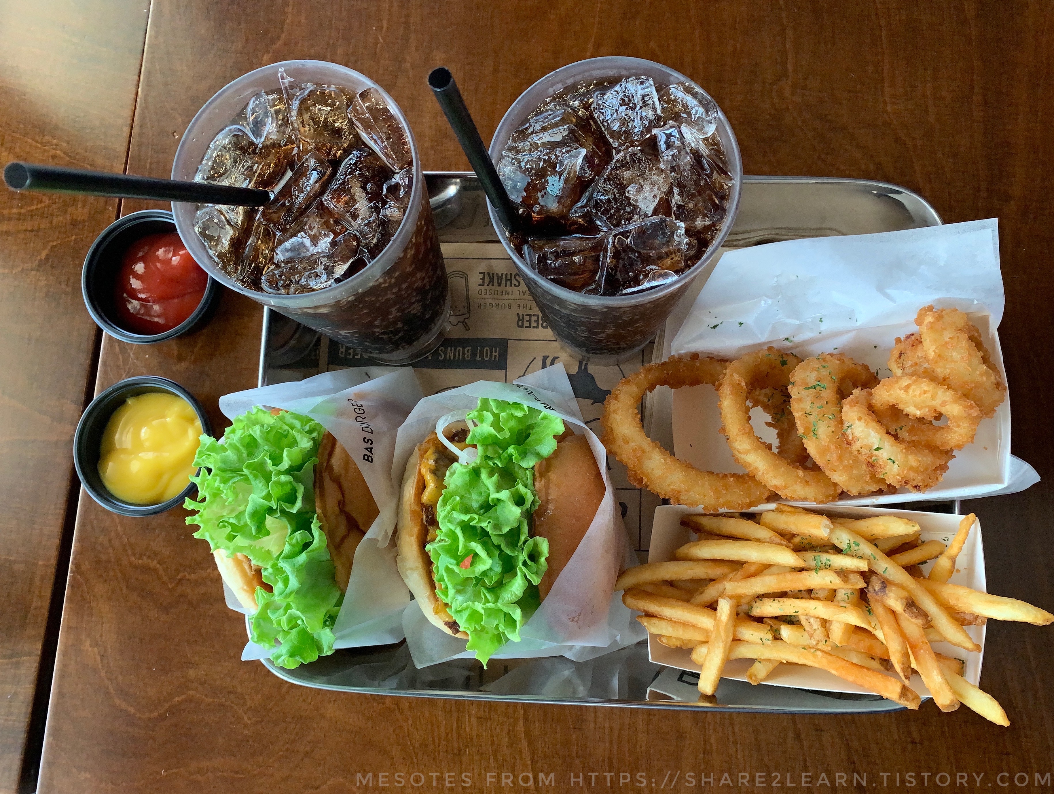메뉴 구성은 바스버거와 콜라, 어니언링, 감자튀김.