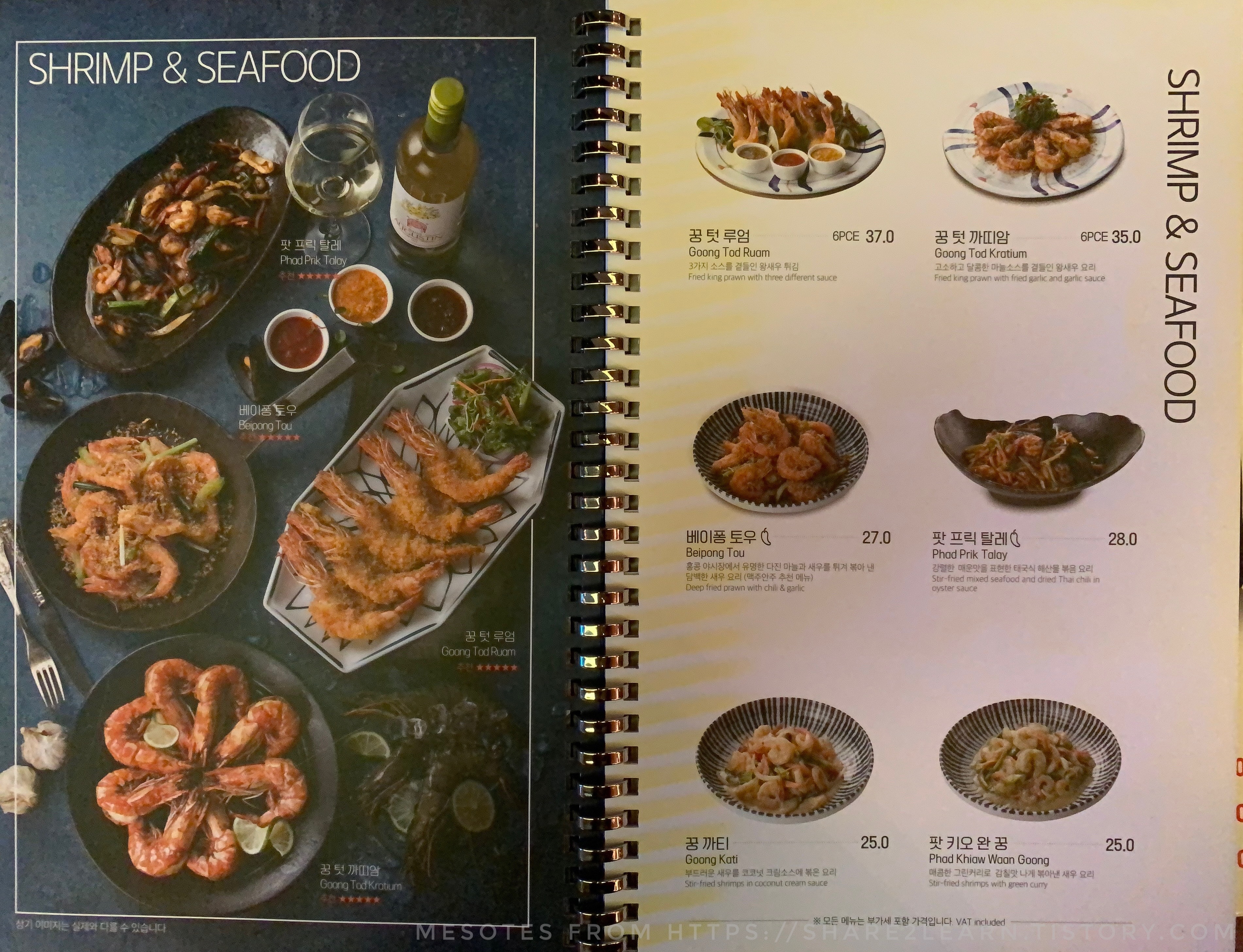 똠얌꿍, 얌운센 탈레, 쏨 땀, 짜죠, 스파이시 타이칠리 누들, 미고랭, 생어거스틴 누들, 까이쌉 랏 카오, 파인애플 볶음밥, 생어거스틴 볶음밥, 뿌 팟 봉커리, 느어 팟 남만호이, 느어 픽타이담, 팟 카파오 느어, 까이 쌈 롯
