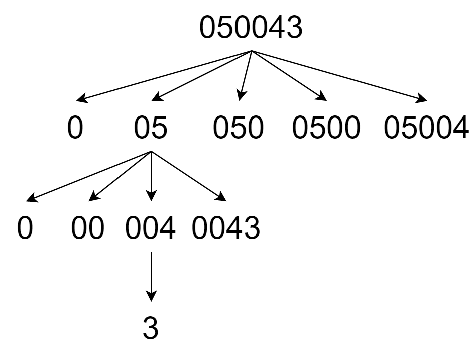 적어도 한 번은 s를 나눠야하므로, 첫 번째 substring은 첫 번째 숫자인 0부터 시작해서 마지막 숫자인 3을 제외한 05004까지 존재가능하다.